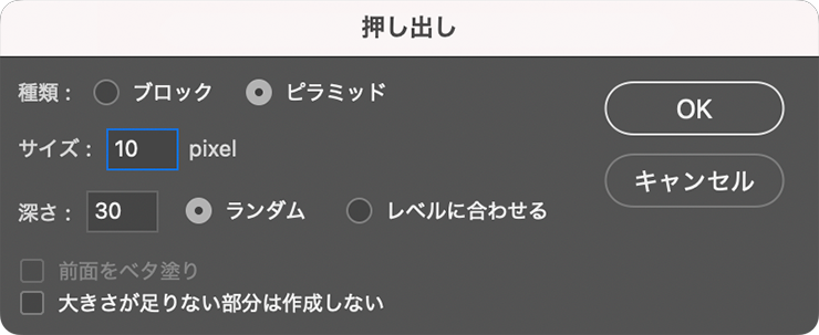文字を加工していく。まずは、フィルターメニュー→“表現手法”→“押し出し...”を、[種類:ピラミッド]、[サイズ:10pixel]、[深さ:30:ランダム]で適用する(図5)(図6)。