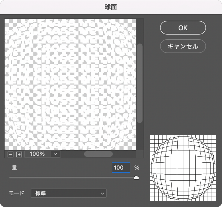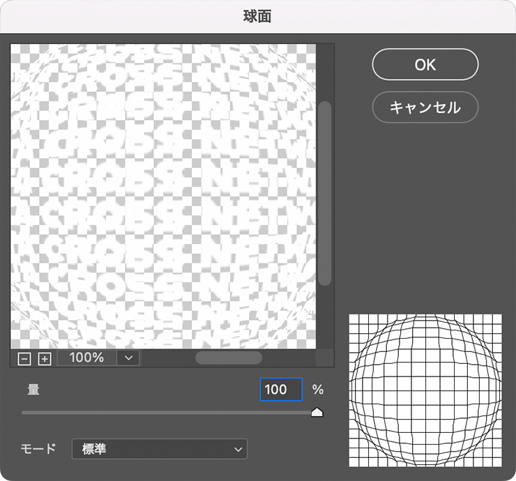 レイヤーパネルで文字のレイヤーを選択したら、フィルターメニュー→“変形”→“球面...”を[量:100%]、[モード:標準]で適用する(図13)(図14)。