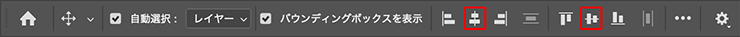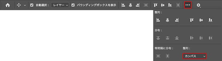 レイヤーパネルで文字のレイヤーと楕円のレイヤーを両方とも選択したら、移動ツールを選び、オプションバーの[整列と分布]の3点アイコン[…]をクリックして[整列:カンバス]に設定(図7)。さらに[水平方向中央揃え]と[垂直方向中央揃え]をクリックして(図8)、文字と楕円をカンバスに対して中央に揃えておく(図9)。