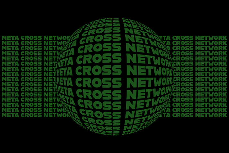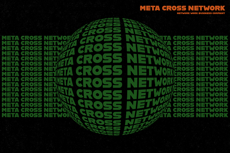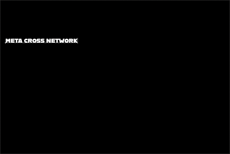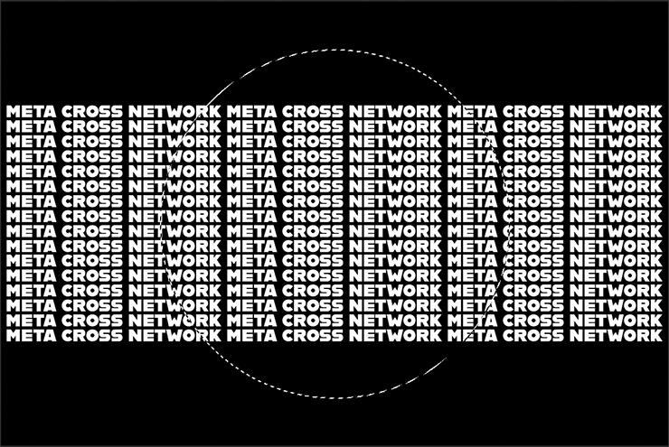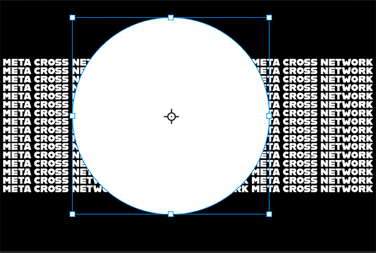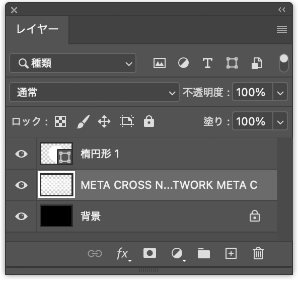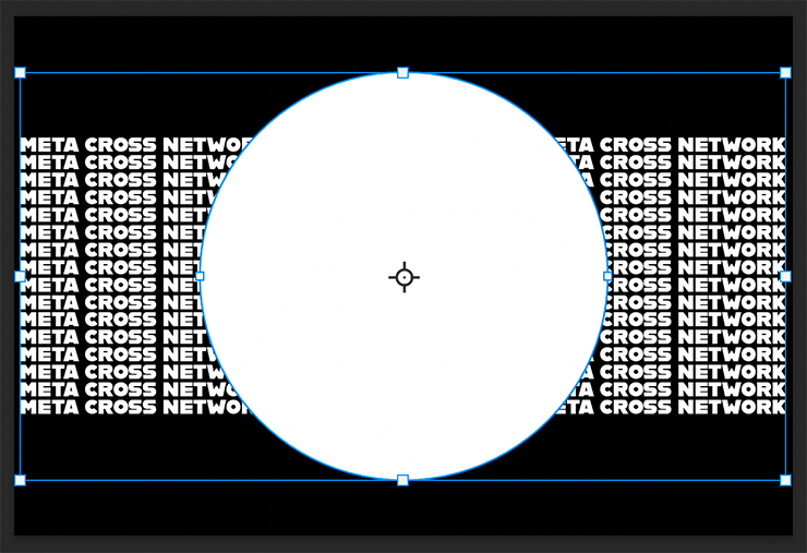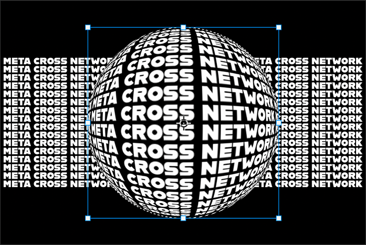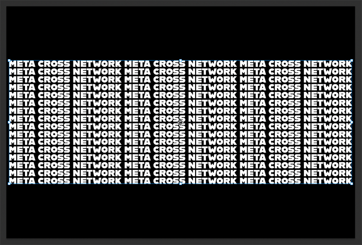 続いて、横書き文字ツールで元になる文字列(ここでは「META CROSS NETWORK」)を入力して文字パネルでフォントやフォントサイズ、フォントカラーなどを設定(図2)。ここでは、その文字列をコピー&ペーストして天地中央に配置した(図3)(図4)。