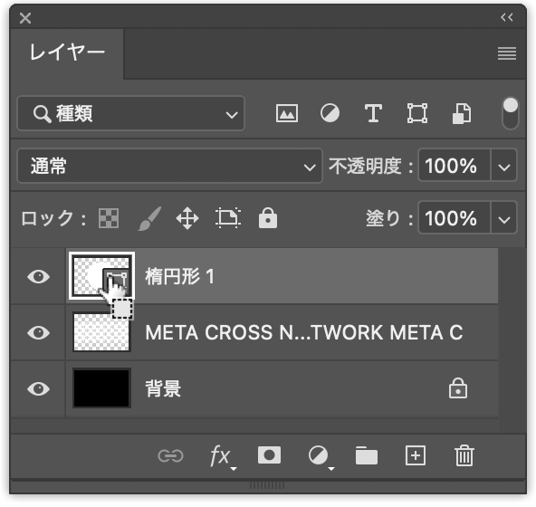続いて、レイヤーパネルでcommandキー(Macの場合。WindowsではCtrlキー)を押しながら楕円のレイヤーのレイヤーサムネールをクリック(図11)。楕円の輪郭に沿って選択範囲が作成されたら、楕円のレイヤーは非表示にしておく(図12)。