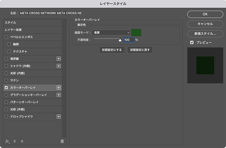 続いて、選択範囲を解除したあと、レイヤーメニュー→“レイヤースタイル”→“カラーオーバーレイ...”を、[描画モード:乗算]、[オーバーレイのカラー]を緑(ここでは16進数カラーコード[#1c541b])、[不透明度:100%]に設定して適用する(図19)(図20)。