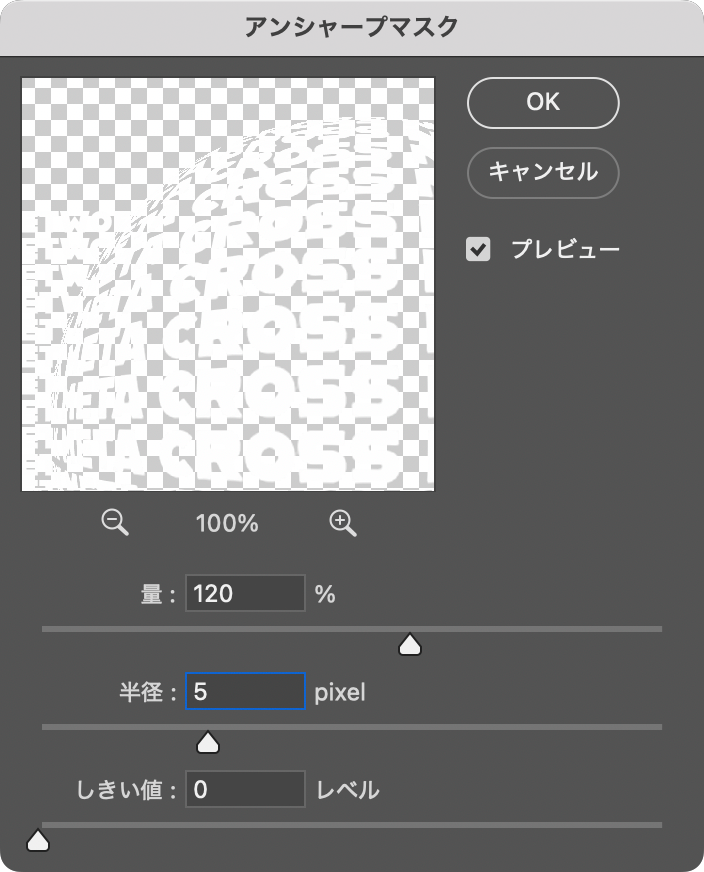 ビジュアルを仕上げていく。まずは、文字のレイヤーが選択された状態のまま、フィルターメニュー→“シャープ”→“アンシャープマスク...”を、[量:120%]、[半径:5pixel]、[しきい値:0レベル]で実行する(図17)(図18)。