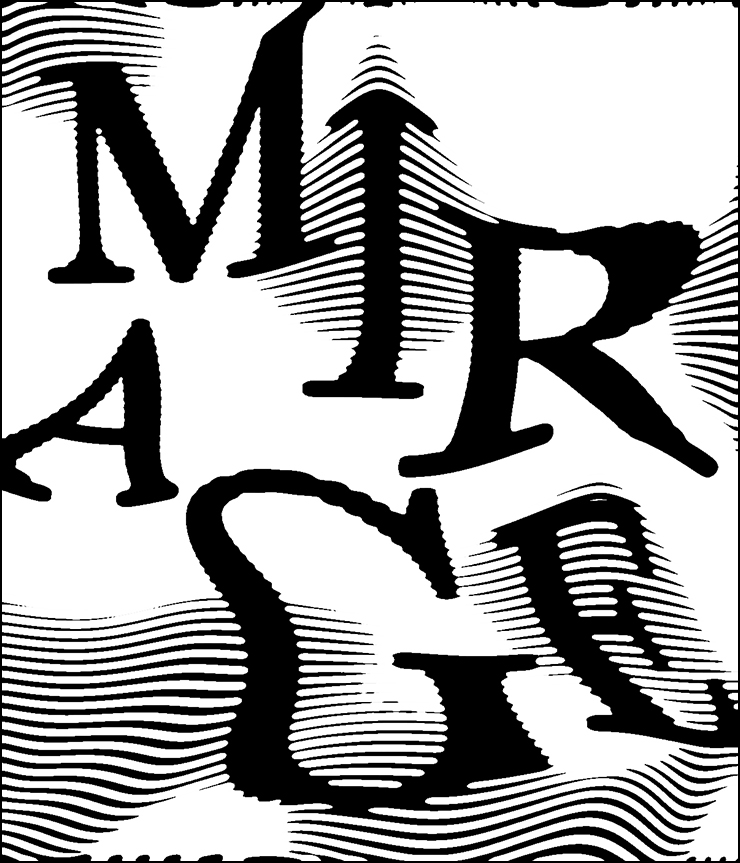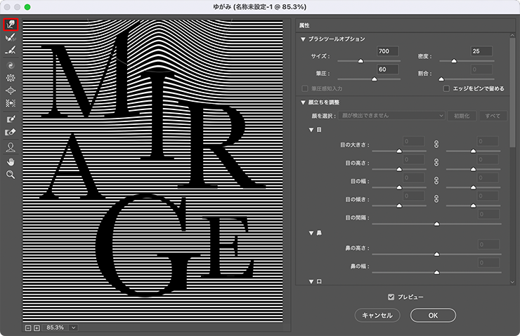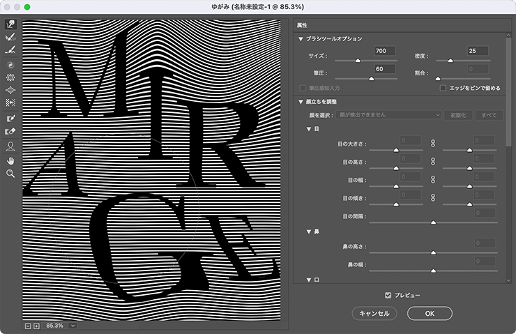 文字と模様を蜃気楼のようにゆがませていく。まず、先ほど結合したレイヤーを選択した状態のまま、フィルターメニュー→“ゆがみ...”を選び、[前方ワープツール]を選択したら、ダイアログ右側の[ブラシツールオプション]を[サイズ:700]、[密度:25]、[筆圧:60]程度に設定。縞模様や文字の上をドラッグするとそれに合わせてぐにゃっと変形するので(図10)、プレビューを参考にしながらゆがませていく(図11)。