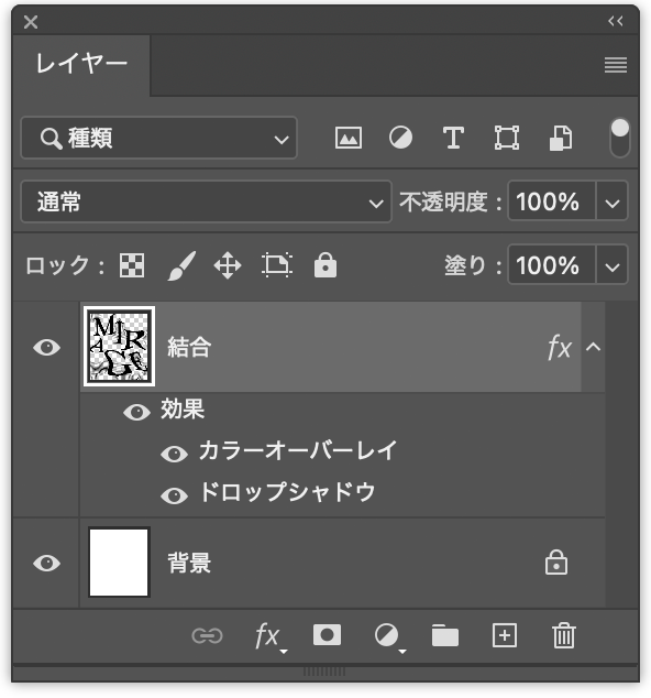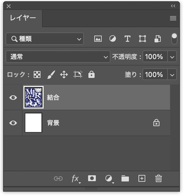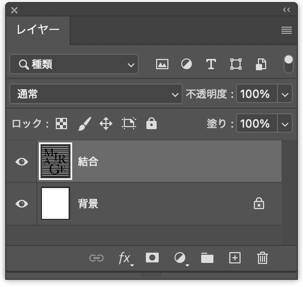 文字が配置できたら、非表示にしておいた縞模様のレイヤーを表示させて背景レイヤー以外をすべて選択し、レイヤーメニュー→“レイヤーを結合”を実行する(図8)(図9)。