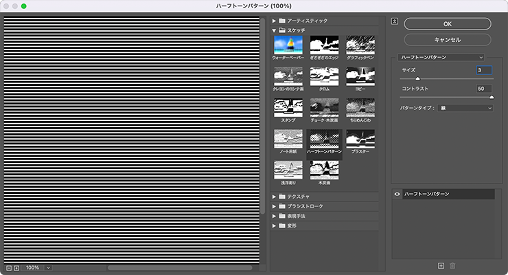 次に、[描画色]を黒、[背景色]を白に設定したら、フィルターメニュー→“フィルターギャラリー...”を選び、[スケッチ]の[ハーフトーンパターン]を[サイズ:3]、[コントラスト:50]、[パターンタイプ:線]で適用する(図2)(図3)。