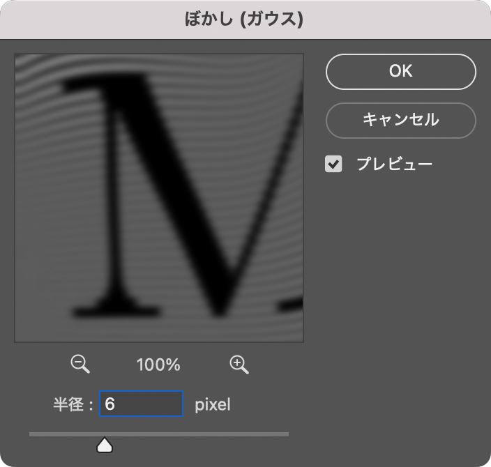 続いて、フィルターメニュー→“ぼかし”→“ぼかし(ガウス)...”を[半径:6pixel]程度で適用する(図13)(図14)。