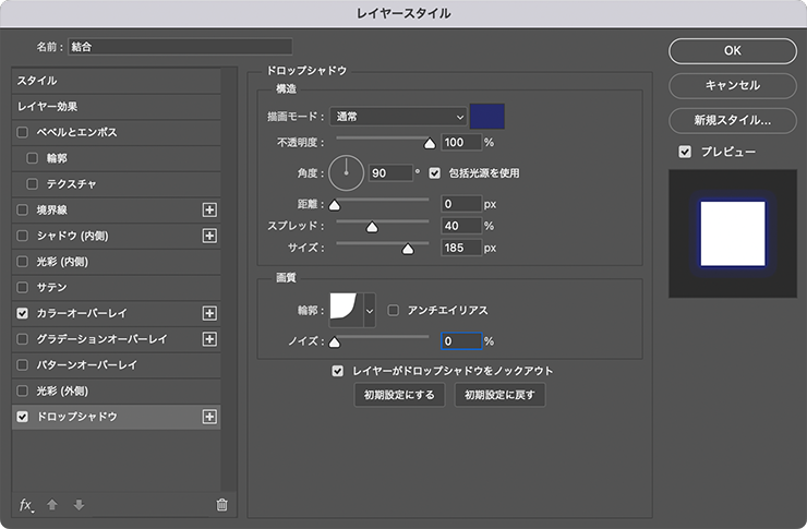 続いてレイヤースタイルの[ドロップシャドウ]を選択し、[描画モード:通常]、[シャドウのカラー]を青(ここでは16進数カラーコード[#262b6c])、[不透明度:100%]、[角度:90°]、[距離:0px]、[スプレッド:40%]、[サイズ:185px]、[輪郭:くぼみ - 深く]、[ノイズ:0%]に設定して適用する(図21)(図22)。