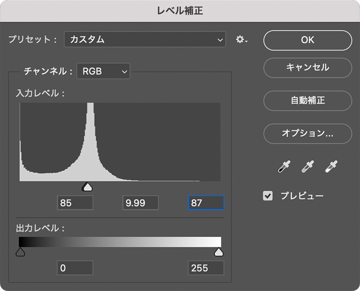 次に、イメージメニュー→“色調補正”→“レベル補正...”を選び、ヒストグラムの下の3つのスライダーをグラフの山の中央くらいに合わせて適用する(図15)(図16)。