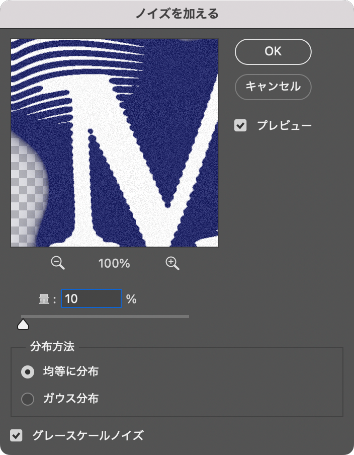 このレイヤーが選択された状態のまま、レイヤーメニュー→“ラスタライズ”→“レイヤースタイル”を実行したら(図23)、フィルターメニュー→“ノイズ”→“ノイズを加える...”を[量:10%]、[分布方法:均等に分布]、[グレースケールノイズ]で適用する(図24)(図25)。