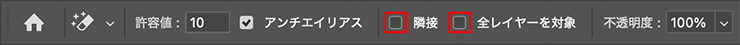 マジック消しゴムツールを選択してオプションバーで[隣接]と[全レイヤーを対象]のチェックを外し(図17)、文字周囲の白い部分をクリックして消去する(図18)。