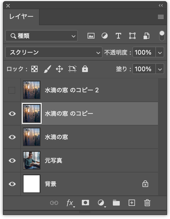 水滴を合成していく。まずレイヤーパネルで、先ほど複製した2枚の水滴のうち背面(下)の方を表示して選択したら、[描画モード:スクリーン]に変更する(図10)(図11)。