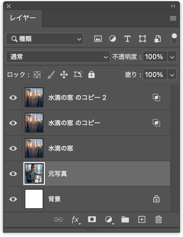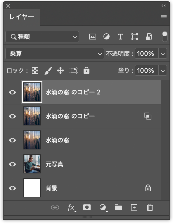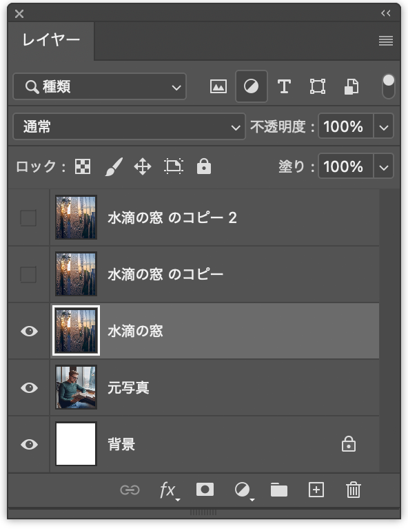 以上、Photoshopで画像を合成して、水滴のついた窓越しの風景を表現する方法でした。