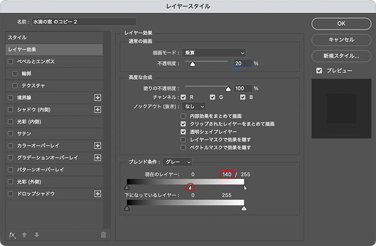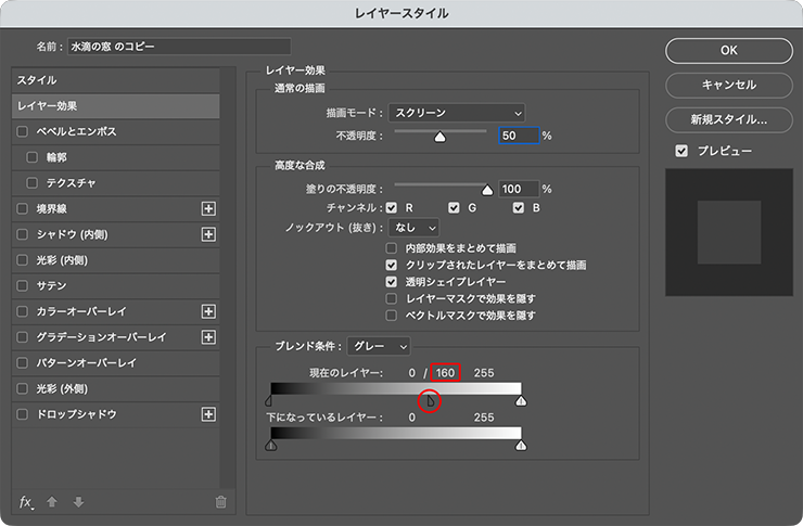続いて、レイヤーメニュー→“レイヤースタイル”→“レイヤー効果...”を選択。[通常の描画]の欄で[不透明度:50%]に変更したあと、[ブレンド条件]の欄の[現在のレイヤー]にある、黒いスライダーの右半分をoptionキー(Macの場合。WindowsではAltキー)を押しながらクリックして分離し、そのままドラッグして右方向に移動させる。これにより水滴の素材を人物写真に馴染ませることができるので、プレビューを参考にしながらちょうどいい見え具合に調節したあと[OK]をクリックして適用する(図12)(図13)。