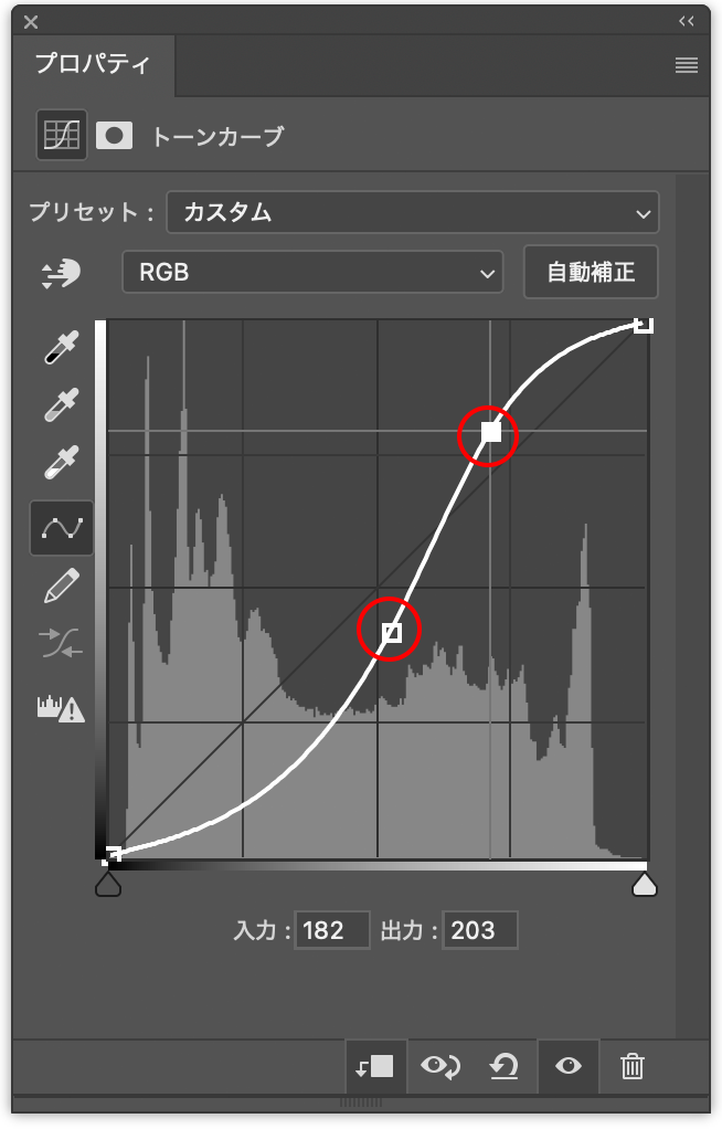 続いて、プロパティパネルでトーンカーブの上を2箇所クリックしてコントロールポイントをふたつ追加したら、それぞれドラッグして調整し、コントラストを少し強調する(図20)(図21)。