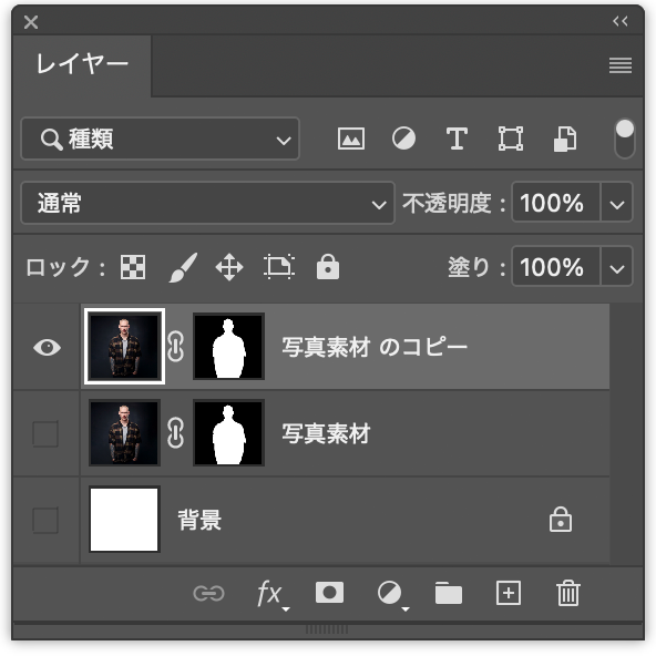 レイヤーパネルで写真素材のレイヤーを前面に複製したら、背景レイヤーと複製元のレイヤーを非表示にし、複製した方のレイヤーを選択する(図3)(図4)。