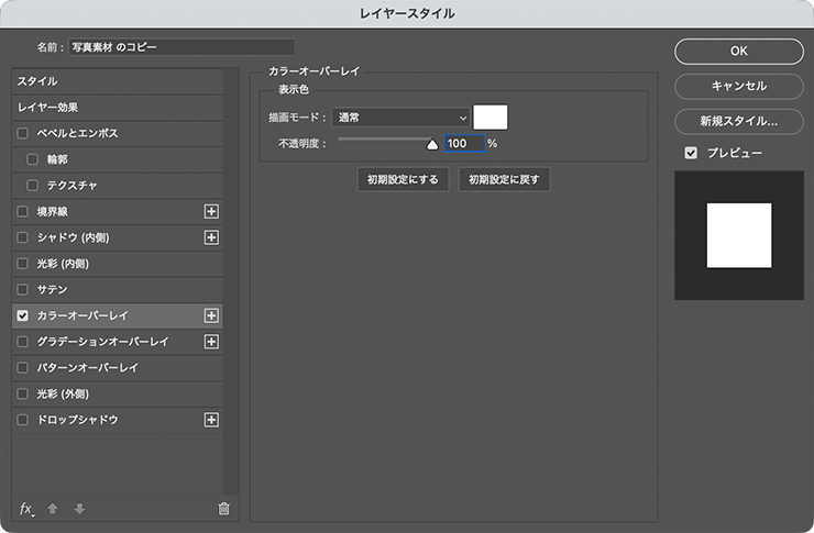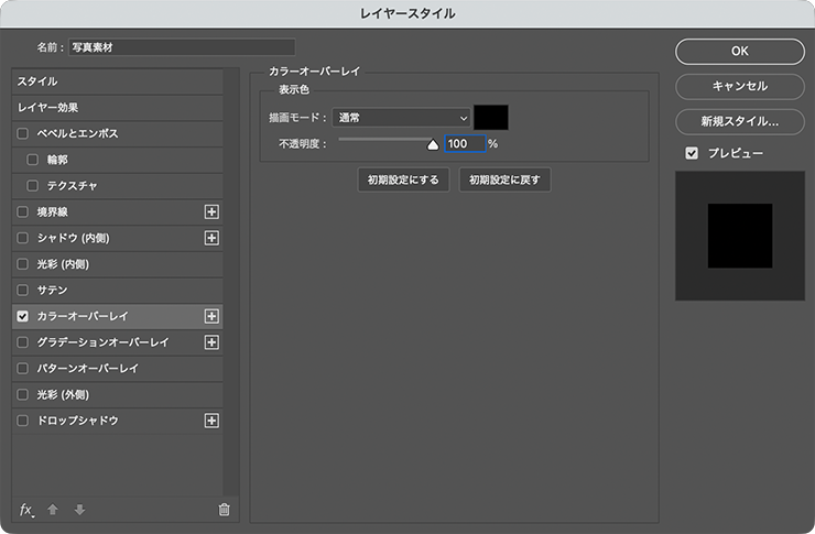 次に、複製元の写真素材のレイヤーを選択したら、レイヤーメニュー→“レイヤースタイル”→“カラーオーバーレイ...”を選び、[描画モード:通常]、[オーバーレイのカラー:黒]、[不透明度:100%]に設定して適用する(図12)(図13)。