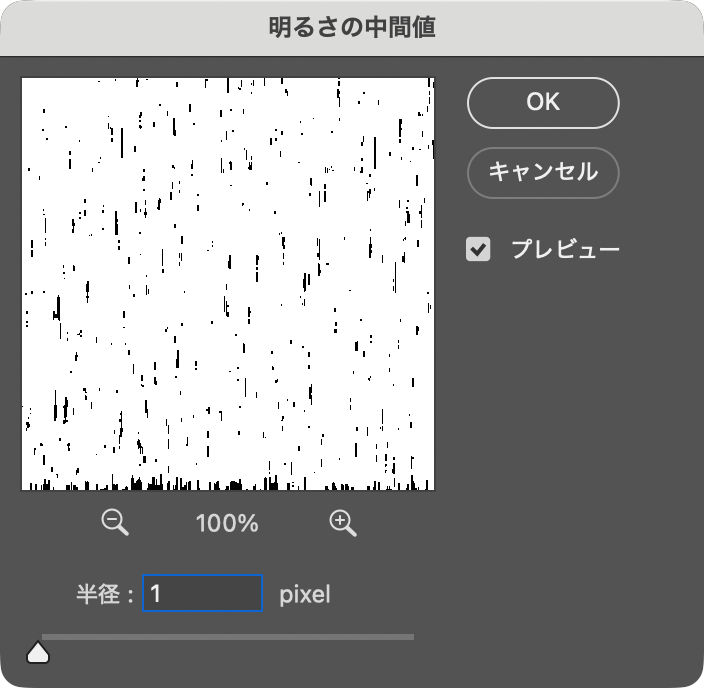 イメージメニュー→“色調補正”→“階調の反転”を実行したあと(図20)、フィルターメニュー→“ノイズ”→“明るさの中間値...”を[半径:1pixel]で適用する(図21)(図22)。