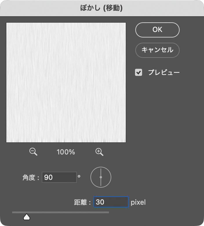 続いて、フィルターメニュー→“ぼかし”→“ぼかし(移動)...”を、[角度:90°]、[距離:30pixel]で適用する(図16)(図17)。