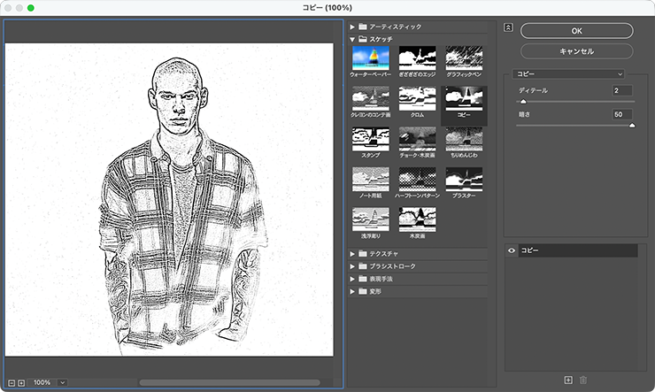 [描画色]を黒、[背景色]を白にしたあと、フィルターメニュー→“フィルターギャラリー...”を選び、[スケッチ]の[コピー]を[ディテール:2]、[暗さ:50]で適用する(図5)(図6)。