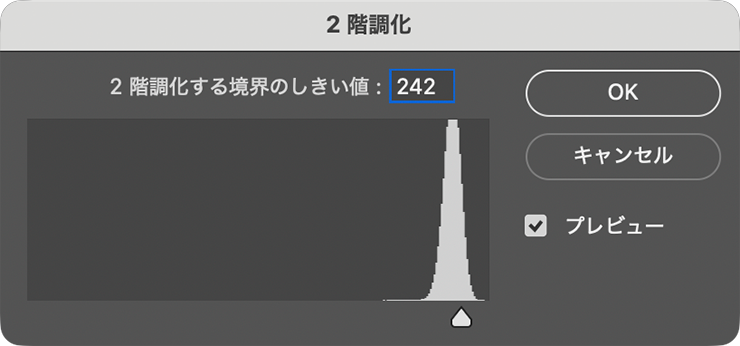 さらに、イメージメニュー→“色調補正”→“2階調化...”を[2階調化する境界のしきい値:242]程度で適用する(図18)(図19)。