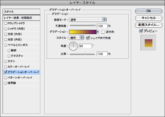 まず、Photoshopで新規ファイルを作成したら、新規レイヤーを用意。ここに適当なサイズの楕円を描く 1-1 。次に、レイヤースタイルの[グラデーションオーバーレイ]を 1-2 のように設定して適用 1-3 。次に新規レイヤーを作成し、レイヤーパネルでshiftキーを押しながらいま作成したレイヤーと楕円のレイヤーを選択。レイヤーメニュー→“レイヤーを結合”を実行する。