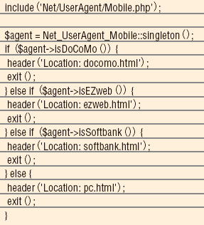 そこで、便利なPHPライブラリがあるので紹介しよう。「Net_UserAgent_Mobile」(pear.php.net/package/Net_UserAgent_Mobile/)は、「PEAR」というPHPのライブラリ群のひとつだ。