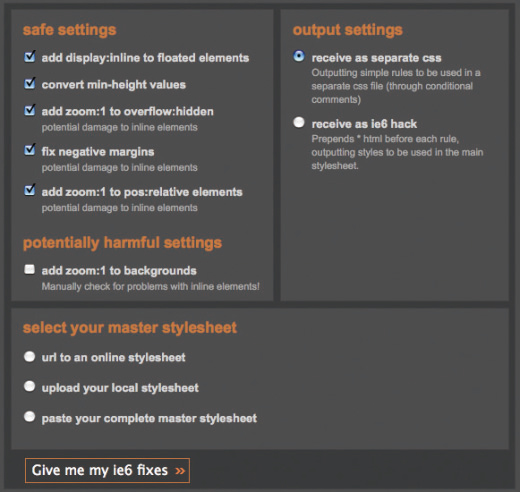 Internet Explorer(以下、IE)6のCSS解釈にはかなり癖があり、ほかのWebブラウザと同じ設定をするためには、工夫をしなければならないことが多々ある。まだまだユーザー数の多いこのブラウザの対応に、頭を悩ませる人も少なくないはずだ。そんな、IE 6専用のCSSを生成してくれるサービスが、「onderhond.com」の「IE 6 CSS Fixer」(www.onderhond.com/tools/ie6fixer)だ【1】。