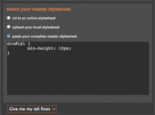 画面の「select your master stylesheet」で、「paste your complete master stylesheet」を選んで、先のCSSを貼り付けよう【3】。そして、「Give me my ie6 fixes」ボタンをクリックすると【4】のようなCSSが生成されるというわけだ。あとは、このファイルを「ie6.css」などという名前で保存をして、コンディショナルコメントなどでインポートすればよいだろう。