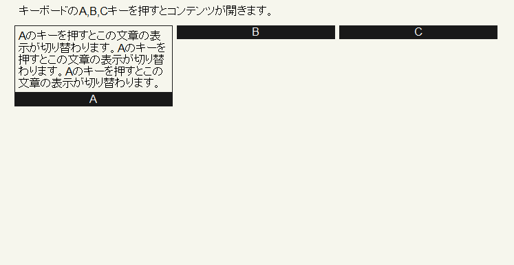 このサイトのデモではキーを押すと要素がプルダウンするアニメーションのみだが、ここでのサンプルではA、B、Cのキーを使いコンテンツを開閉するようにする【1】。