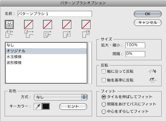1Illustratorで 1-1 のようなパーツをつくる。次に、作成したパーツをブラシパネルにドラッグし、ダイアログで[パターンブラシ]を選択。続いて、パターンブラシオプションダイアログで 1-2 のように設定して実行する。これで、作成したパターンをブラシとして登録できる。
