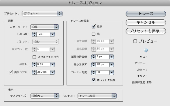 4再びIllustratorのファイルに戻り、工程3で作成した飾り罫の画像を配置。そのまま、オブジェクトメニュー→“ライブトレース”→“トレースオプション...”で 4-1 のように設定したら[トレース]ボタンをクリック。さらに、オブジェクトメニュー→“分割・拡張...”を実行する 4-2 。あとは、フレームの塗りを変更し、写真の縁に配置すればよい 4-3