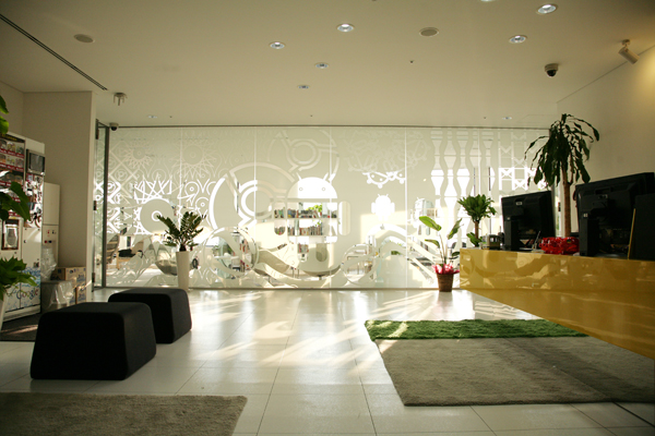 窓からの開放的な光にあふれたエントランス。ポップな色づかいが楽しい。内装を手がけたのはクラインダイサムアーキテクツ