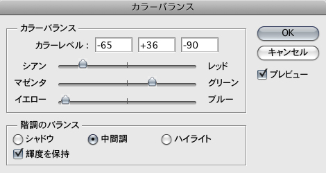 次に、レイヤーメニュー→“新規調整レイヤー”→“カラーバランス...”を選択したら、 2-1 のように設定。今回は全体の色調を緑色に崩した 2-2 。さらに、レイヤーメニュー→“新規調整レイヤー”→“白黒...”を選択し、表示されるダイアログで彩度などを調整。この調整レイヤーを[描画モード:ソフトライト]として、全体のコントラストを強めた 2-3 。