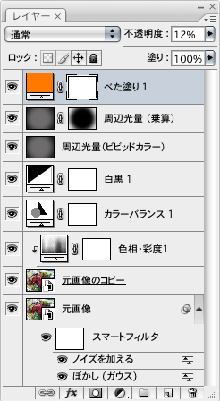 続いて、最背面のレイヤーを選択し、“ぼかし"→“ぼかし(ガウス)...”フィルタで全体を軽くぼかす。さらに、“ノイズ”→“ノイズを加える...”フィルタでノイズを加え、粒状感を表現した 4-1 。最後に、レイヤーメニュー→“新規塗りつぶしレイヤー”→“ベタ塗り...”を選択して[OK]としたら、ダイアログでオレンジ色を選択して実行。このレイヤーを最前面に配置して不透明度を調整すれば、トイカメラ風のチープな色調に仕上げることができる 4-2 。なお、最終的なレイヤーの構成は 4-3 のようになっている。