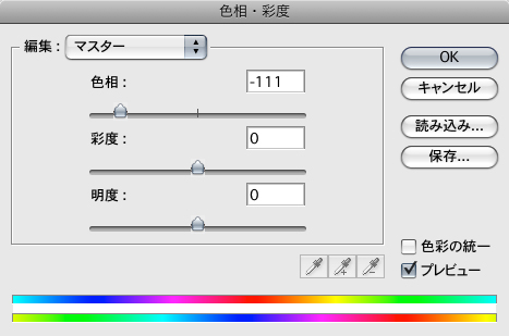 続いて、素材の色味に変化を加えていく。まず、点描の素材になげなわツールなどを使って選択範囲を作成したら、イメージメニュー→“色調補正”→“色相・彩度...”を実行 3-1 。ダイアログの各項目の値を変えて色味を調整する 3-2 。この要領で、そのほかの素材の色味も変えていった。