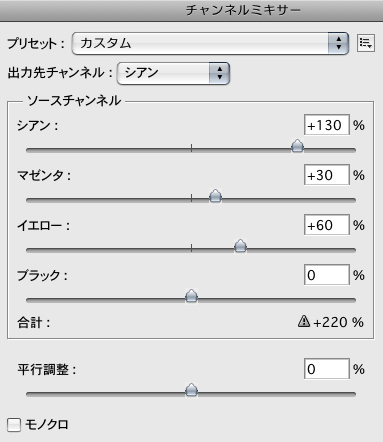 | 調整レイヤーを利用して色合いや質感に変化をつける 調整レイヤーを利用して、仕上がりの印象を大きく変える方法をひとつ紹介しよう。まず、“新規調整レイヤー”→“チャンネルミキサー...”を実行したら、各チャンネルの値を変えて、色味を調整していく 1 。ここでは各ソースチャンネルの値を調整し、青みがかった色合いに変更。さらに、背景に配置した紙のテクスチャを布に変更することで、イメージを大きく変えた 2 。 |
