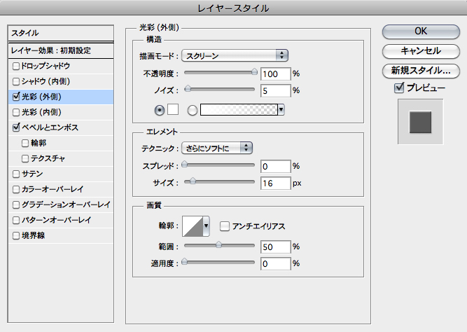 次に、文字レイヤーのレイヤースタイルダイアログを開き、[光彩(外側)]を 2-1 の設定で適用。その際、[光彩のカラー]は白に変更しておくのがポイント。続いて[ベベルとエンボス]を[スタイル:エンボス]、[深さ:900%]、[サイズ:2px]、[ソフト:4px]、[角度:120°]、ハイライトの[不透明度]を100%、シャドウの[不透明度]を50%に変更して適用する。 |