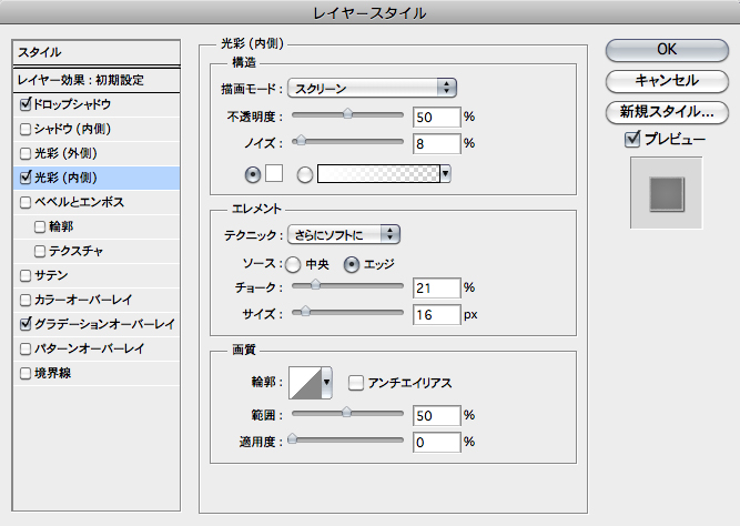 ベースの長方形レイヤーのレイヤースタイルダイアログを開き、[ドロップシャドウ]を初期値で適用。さらに[光彩(内側)]を 3-1 のように設定したら、[グラデーションオーバーレイ]を[描画モード:スクリーン]、[不透明度:25%]、[スタイル:円形]、[比率:150%]に変更し、[逆方向]にチェックして適用。あとは長方形の端を、なげなわツールでラフに囲んで選択範囲を作成し、deleteキーを押して消去すれば完成 3-2 。 |
