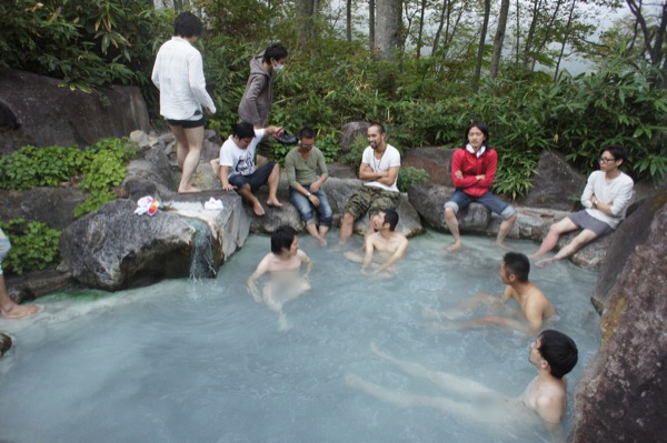 みんなで寒い中、燕温泉の人気野天風呂「黄金の湯」へ。なぜか、とてもぬるく…当然、入浴する人は少なく、足湯で温泉に入ったぜ感を出す人が多数続出。