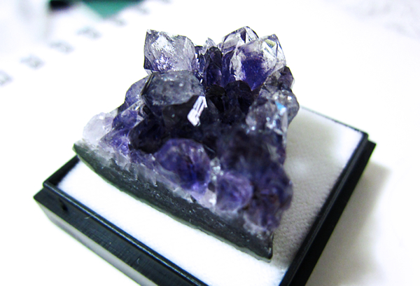 一日中パソコンとにらめっこでさすがに疲れたので、鉱石を眺めて和む。宝石よりも鉱石の方が好きです。下の写真は書店で行われていた「鉱石フェア」の時に手に入れたアメジスト(紫水晶)。これは先端が紫ではないですが、高価なアメジストは全体が濃い紫色で、とても綺麗です。家には他に3個ほど置いてあります。ちなみに今一番欲しいのは星入り水晶。放射状の結晶が中に入っていて、星のような形をしている水晶です。マダガスカルではお守りとして利用されているのだそう。