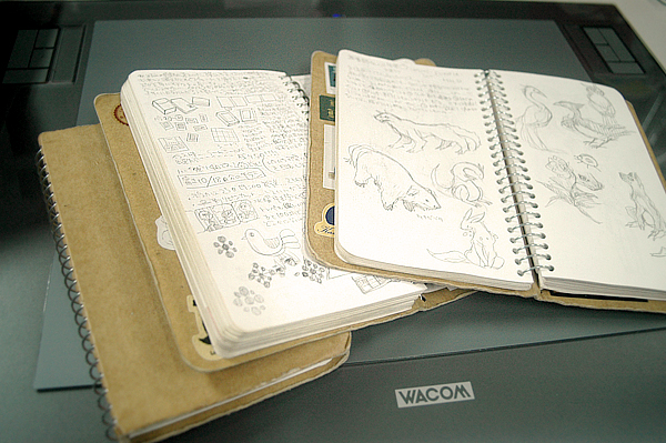 今度は昨日打ち合わせしたイラストを描いていきます。絵を描くのはとにかく好きなので、いつもノートを持ち歩いて、そこに公私混同でいろんな絵を描いています。打ち合わせの時間からマンガのネーム、日記まで…とにかく全部、何でも。以前はスケジュール帳を別にして書いていたのですが、三日坊主だったので、このシンプルなリングノートに変えてみました。いつでも何でも気が向いたときに、さらっと書けるのが良かったみたいで、このノートは現在3冊目に突入。ちなみに、気に入ったものを切り抜いてノートに貼るのが好きなタイプ。裏表紙には気に入った包み紙のモチーフやシールなど、いろいろと貼り込んでいます。