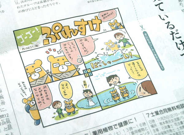 昨日の続き、4コマ漫画をせっせと描いています。出来上がった漫画はこんな感じで、毎週、熊本日日新聞の土曜の朝刊に掲載されます!