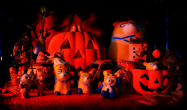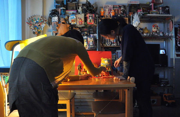 昨日、色を塗った「ぷれすけ」人形を使って、ネストグラフィックスのグリーティングカード用の撮影を社内で行いました。ハロウィンっぽい小物を置いて、位置を調整しつつ、なかなか怖い感じに仕上がり大満足。こういうプチホラーなテイストが好きなのです。ちなみに、好きなホラー映画は『呪怨』。何度でも楽しめる日本のホラー映画の傑作だと思います!
