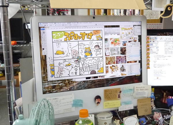▲4コマ漫画を作業中の私のデスクトップ。こうして見ると、パソコンにいろんなものを貼ってますね…(汗)