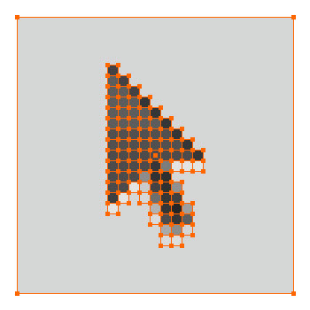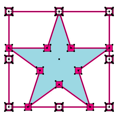 ![]() こちらは描き起こした図版。アンカーポイントは正方形、セグメントやバウンディングボックスは線でできています。こういう作業するときは、ポイントスナップが便利です。あと、隠れちゃった中心の戻し方知ってると便利です。 |