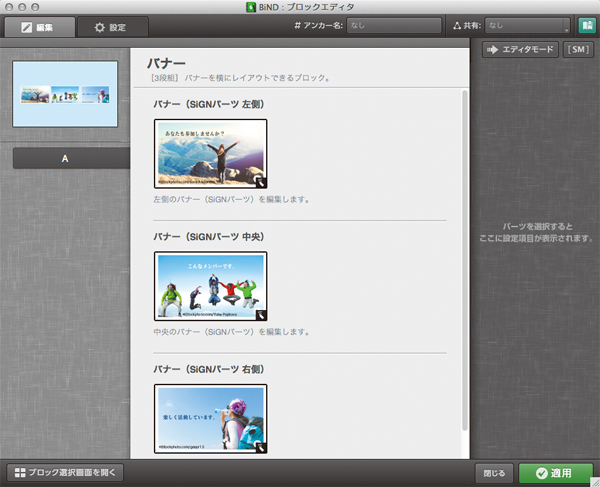 BiND 6では、レイアウトのパーツをすばやく作成、アレンジできる「スマートモード」機能を新搭載(左)。目的別のパーツを選び(右)、フォームに文字や画像を入れていくだけで、複雑なサイトのデザインが手軽に制作できる(▲クリックで拡大)
