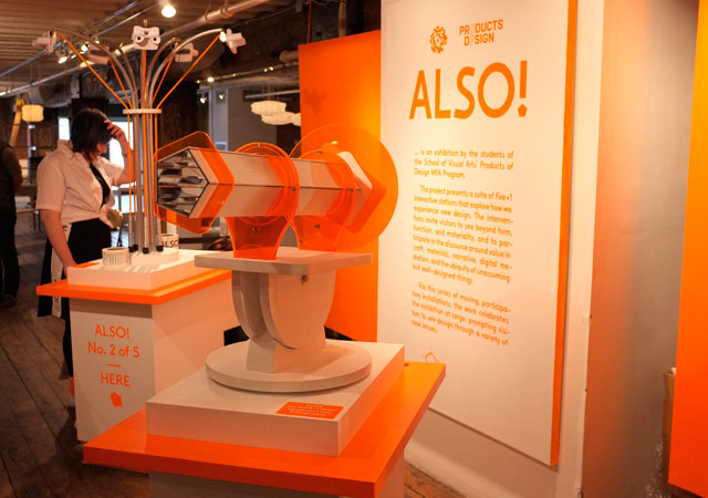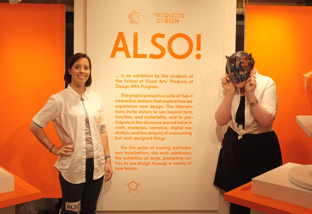 実はこれ、色々な仕掛けを通じて非日常的な視覚体験をしてもらいながら、デザインのあり方に新しい視点を持ってもらう、参加型のインスタレーションだという。スクール・オブ・ビジュアル・アーツ(ニューヨークにある私立美大)の大学院生たちによる「ALSO!」というプロジェクトで、学生たちは元気に声をかけながら来場者を集めていた。「なるほど、これは学生が業界の色々な人たちと楽しく交流する場でもあるなんだな」と思った。