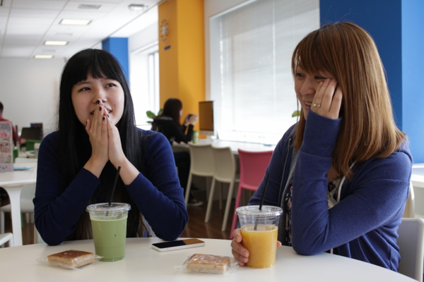 今朝は少し時間があったので、先輩デザイナーのしょこさんと一緒に、社内のカフェで息抜き。