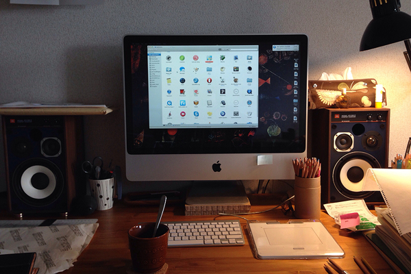 ▲自宅の作業環境です。集中し始めると、だんだん机の上が狭くなっていきます